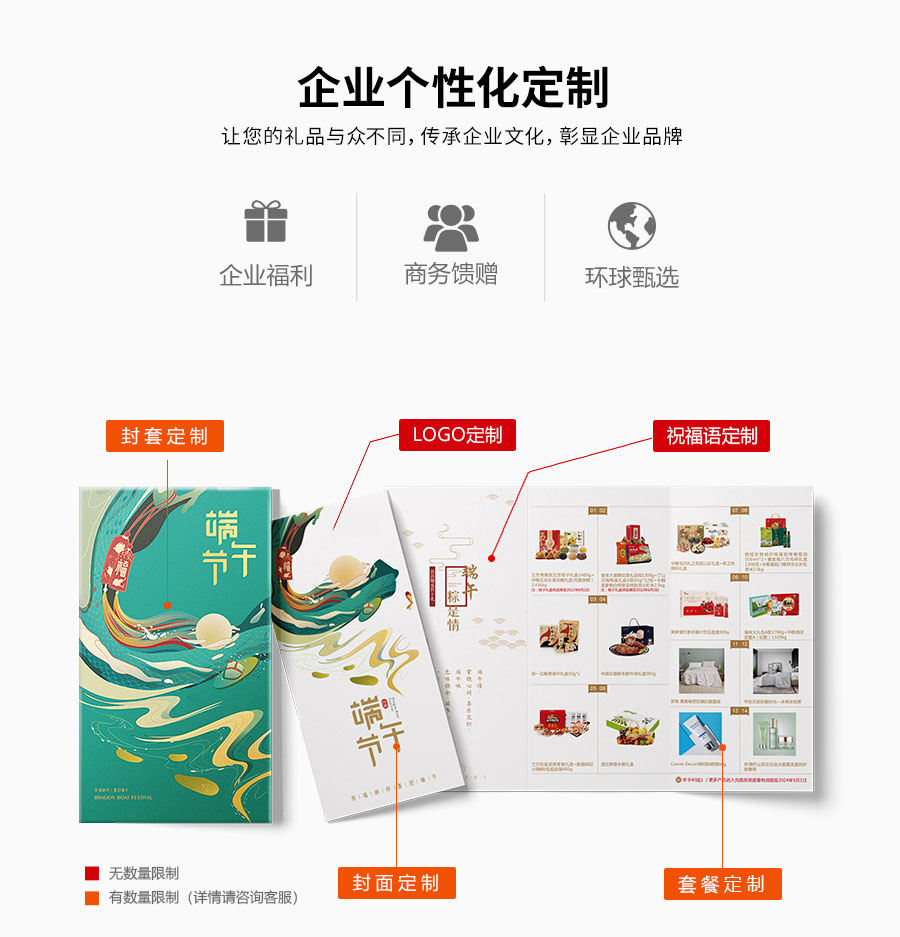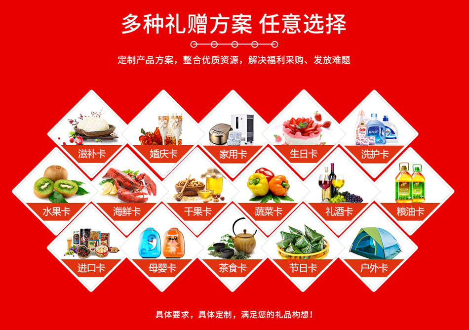 綠田園的多選一禮品卡、禮品冊(cè)免費(fèi)定制服務(wù)滿足客戶對(duì)饋贈(zèng)時(shí)間,對(duì)象,預(yù)算的不同需求,讓您可在節(jié)日、紀(jì)念日使用我們的禮品卡/冊(cè)傳達(dá)祝福。我們有設(shè)計(jì)團(tuán)隊(duì)免費(fèi)按您的需要為您設(shè)計(jì)禮品卡樣,還可以設(shè)計(jì)上您公司的Logo和祝福語(yǔ),讓您的心意傳達(dá)清晰到位。另外,我們的產(chǎn)品部也會(huì)根據(jù)客戶的需要貼心為客戶免費(fèi)做禮品卡金額定制,卡內(nèi)的禮品套餐數(shù)量和產(chǎn)品組合也可為您重新整合設(shè)計(jì)。