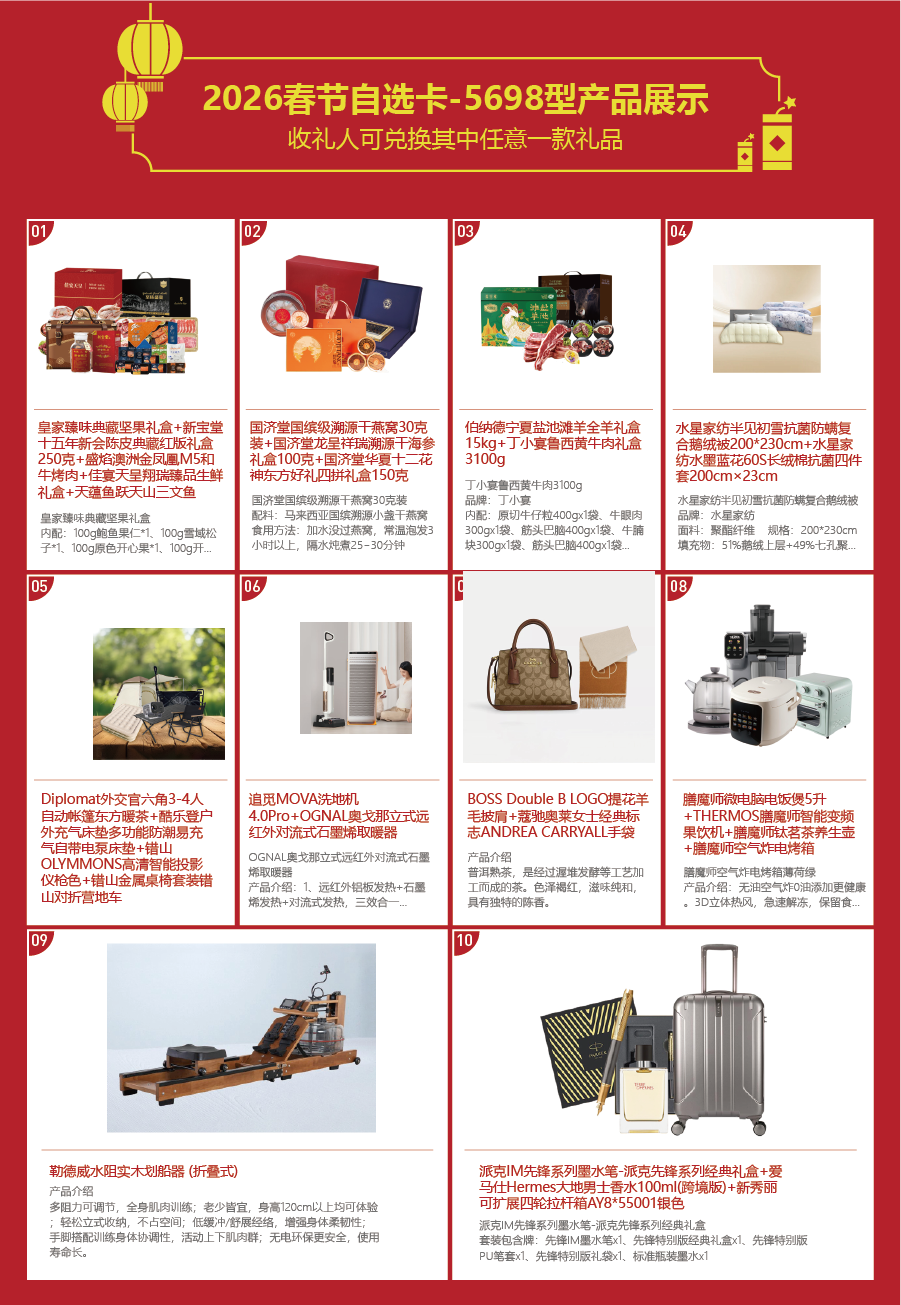 2026春節(jié)禮品卡類型:5698元 │ 3698元 │2698元 │1698元│ 1198元│ 898元│ 598元│ 398元│ 298元 │198元 點擊可查看更多節(jié)日禮品卡內(nèi)容