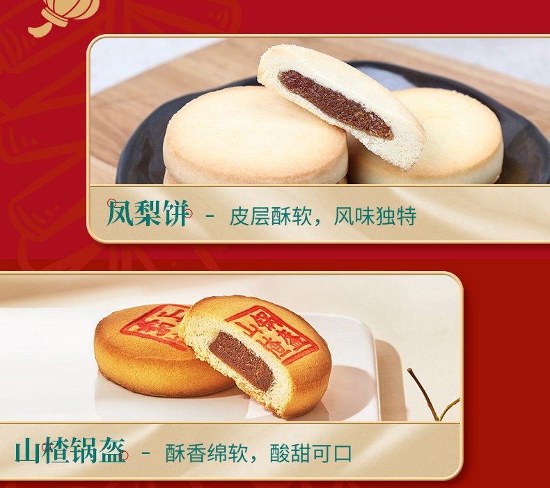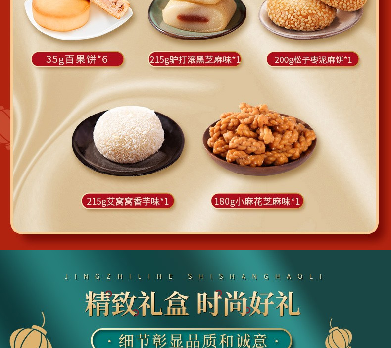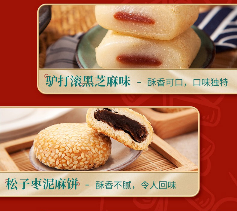 鳳梨餅35g*6、山楂鍋盔35g*6、豆沙餅35g*6、百果餅35g*6、驢打滾(黑芝麻味)215g、松子棗泥麻餅200g、艾窩窩(香芋味)215g、小麻花(芝麻味)180g