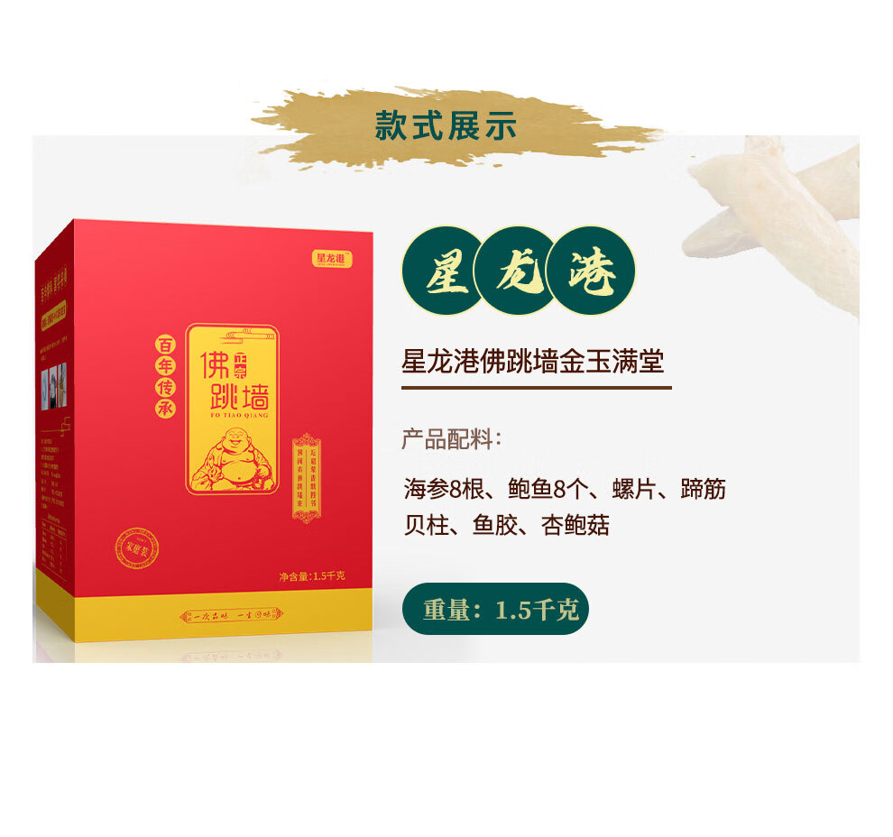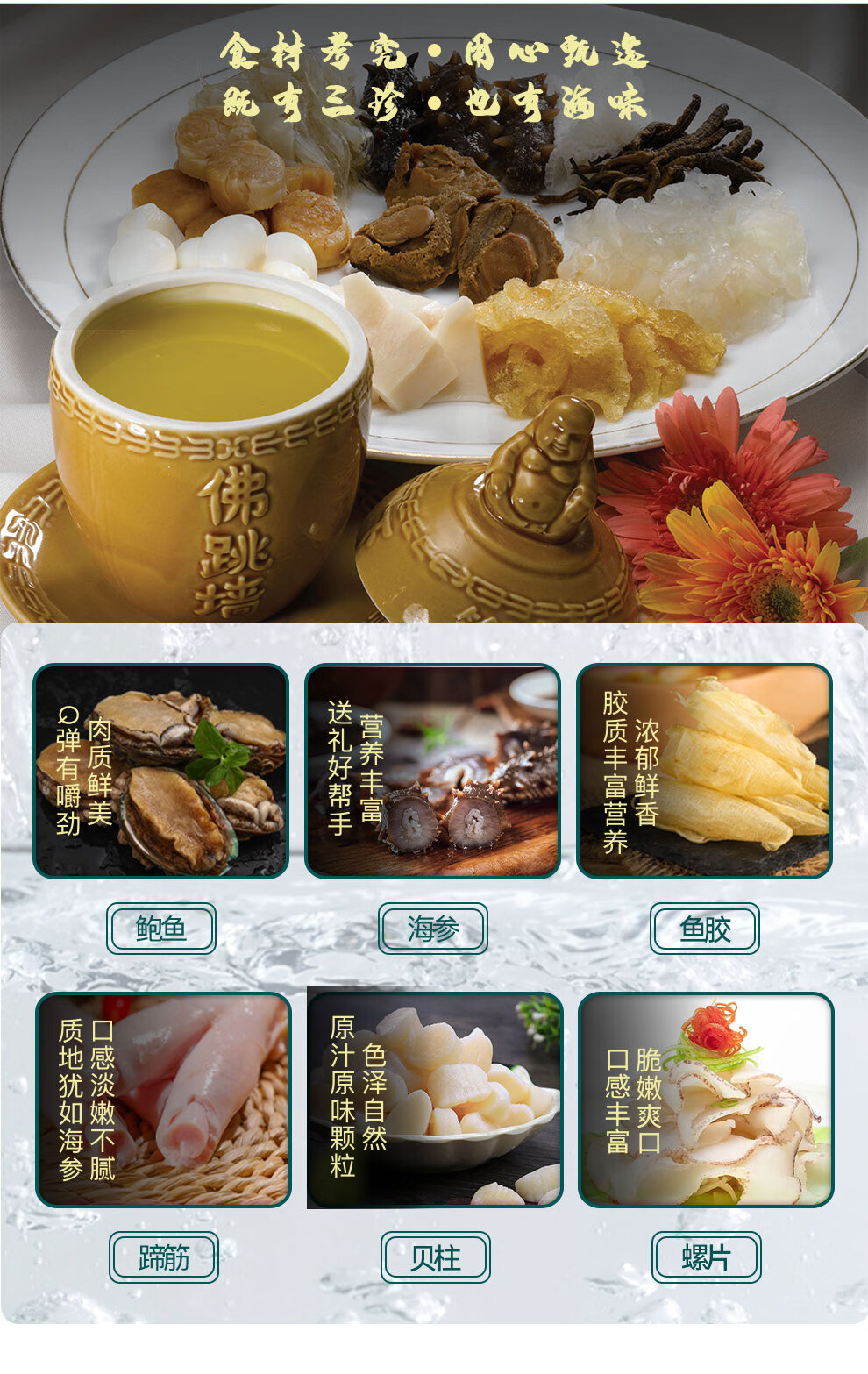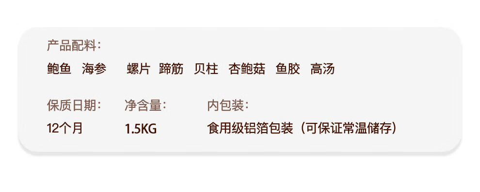 海參8根、鮑魚8個、螺片,蹄筋、貝柱、魚膠、杏鮑菇 保質(zhì)期:冷凍保存12個月 禮盒尺寸:220x220x272mm