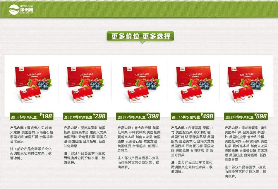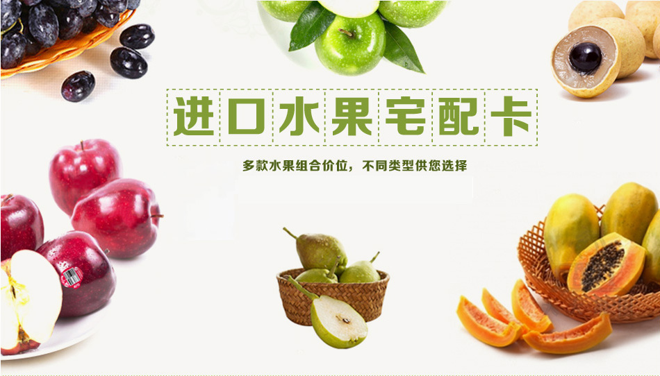 進(jìn)口水果宅配卡類型: 198型 298型 398型 498型 598型(更多價(jià)位產(chǎn)品請致電咨詢…)